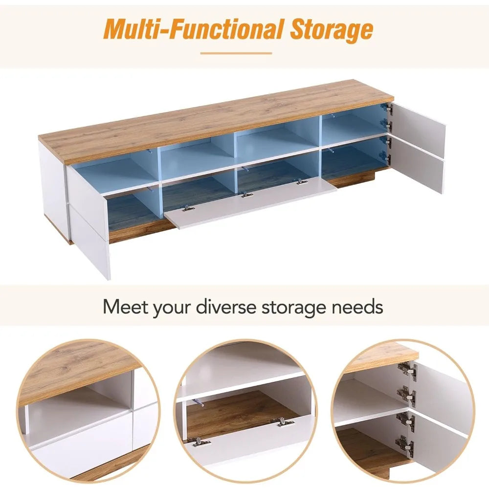- This wood TV stand features plenty of integrated storage space. The 2 center open spaces with cable holes are ideal for electronics, media devices and more.